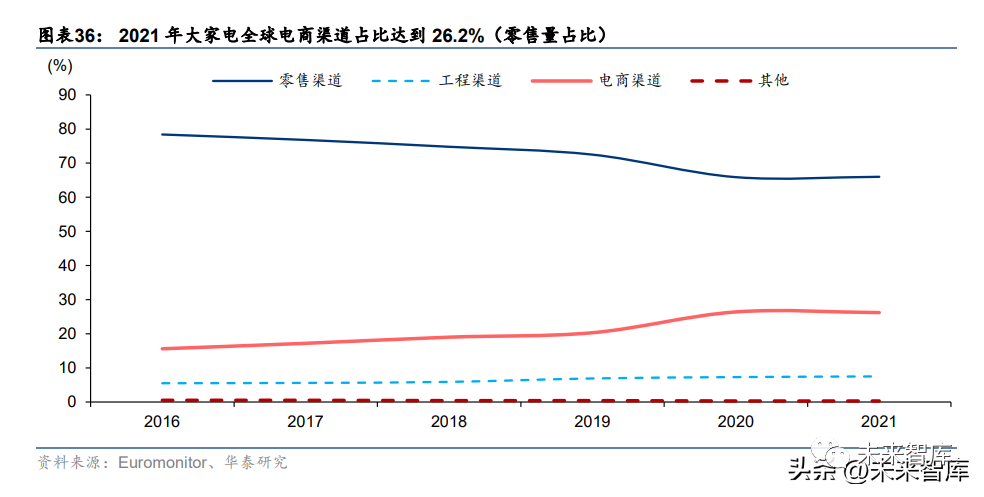 整體來看,目前中國家電企業產能外溢快于品牌外溢。核心在于海外市場難以切入,歐美 企業日韓在上世紀 80-90 年已經在亞洲市場有強大的影響力,也在發展初期階段,取得了 消費者對于品牌和產品可靠性、性價比的認可,更早占據了目標市場消費者的品牌認知與 渠道認知,相對穩態的市場環境讓中國企業繼續切入這些市場時面臨更大的挑戰。而海外居家需求的波動誠然讓需求變得更難預測,但也讓市場結構有了更大的變化。中國 企業供應鏈穩定凸顯,且家電制造業通過多年迭代與積累,產品可靠性并不輸于海外對手, 雖然海外本土渠道仍較難切入,但海外電商平臺、跨境電商等方式讓更多消費者能夠觸達 中國家電產品,弱化了品牌及渠道要求,因此我們認為疫情后是中國家電企業海外大跨步 發展的契機。居家需求催化全球家電線上渠道。線下消費雖仍占據全球家電消費主導地位,但居家需求 催化線上渠道,渠道變化帶來新增長契機。從當前全球家電終端零售渠道來看,渠道多元 化趨勢持續,線上電商渠道的快速發展,也使得海外家電銷售更趨多元。我們認為電商能 夠得到長足增長的原因主要在于:(1)居家需求從 2020 年以來快速成長,加速了線上購物 的消費者認知;(2)線上線下渠道融合及線上配套設施的加速成長;(3)較高頻小家電線 上消費帶動較低頻大家電線上消費;(4)價格更為親民;(5)可供選擇的品類齊全。