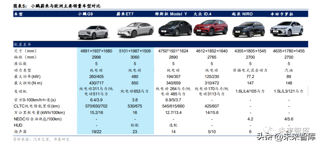 蔚來小鵬產品智能化優勢顯著。將小鵬 P5、蔚來 ET7 與歐洲主要新能源車特斯拉 Model Y、 大眾 ID.4、起亞 NIRO 及傳統燃油車豐田卡羅拉對比,我國蔚來、小鵬智能化水平遠超大 眾、起亞等上述車型。以蔚來 ET7 為例,蔚來 NAD 通過 1 顆激光雷達+11 個攝像頭+5 個 毫米波雷達+12 個超聲波雷達等多傳感器可以實現包括高速領航輔助的 21 項安全與智能輔 助功能。座艙方面,ET7 搭載多屏互動和抬頭顯示 HUD,同時配備 AR 與杜比音響等設置 提供豪華娛樂體驗。此外,動力系統方面,蔚來 ET7的 CLTC最高續航里程最高達到675km, 最大功率達 480kW,最大扭矩 850N.m,同時配套換電技術,實現更好充電體驗。