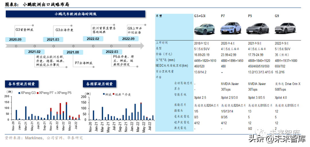 小鵬于 2020 年正式開啟全球化戰略。當年 9 月 G3 車型首登挪威,并于 2021 年 1 月出海 丹麥。此后,小鵬汽車不斷加快出海速度,持續開拓歐洲市場,銷售范圍目前先后拓展至 瑞典、荷蘭,銷售車型覆蓋 G3、P5 和 P7,不斷豐富小鵬汽車在海外的產品布局,至今小 鵬海外累計銷量 1,115 輛(其中 G3 達到 846 輛,P7 為 253 輛)。今年上半年,小鵬先后 在以上四國開啟首個直營店,并與歐洲頭部經銷商集團——荷蘭 Emil Frey NV 集團以及瑞 典 Bilia 集團達成戰略合作,推動小鵬汽車優勢車型快速導入當地,以直營+授權的新零售 模式加速拓展海外市場。2022年4Q,小鵬首款基于全球制造標準打造的車型G9開始交付, 計劃未來出口多個國家和地區。