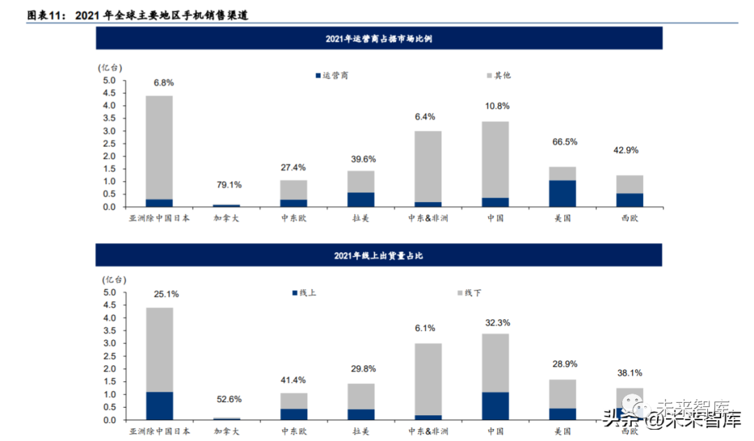 不同海外市場手機銷售渠道差距較大。如東南亞和印度市場地理位置和文化與中國相近, 零售體系以“夫妻老婆店”為主,手機銷售需要建立起與這些社區零售市場深入的合作;在非洲市場由于互聯網以及手機滲透率較低,基礎設施不完善導致運營商地位相對弱勢, 手機廠商主要通過經銷商銷售,電商滲透率低且線下營銷占據絕對比例,使得當地的“地 推”式營銷更甚于中國和東南亞;而西歐、北美、拉美市場主要是運營影響力較大,消費 者對運營商有著習慣性依賴,能否進入運營商渠道,直接決定了一款手機的出貨量。