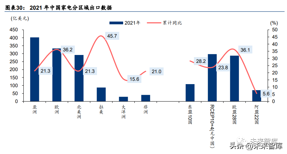 重視亞洲市場的拉動作用。區域結構上,結合中國機電產品進出口商會 2021 年數據,中國 對亞洲其他國家出口占整體出口的 34%,而對歐洲+北美洲合計家電出口額占整體出口的 53%,回顧歷史增速,十三五期間(2016-2020 年),家電出口年平均增速為 8.1%,但東 盟為 12.3%,歐洲為 10.6%,美國為 9.6%,表現好于整體家電出口。考慮到全球宏觀經濟滯脹及衰退影響下,歐洲經濟受挫明顯,而美國居民實際收入受到高 通脹影響,對比而言,隨著 RCEP 的簽訂,東亞、東盟和南亞國家的家電出口或進一步增 強,亞洲國家仍為重要潛力市場。