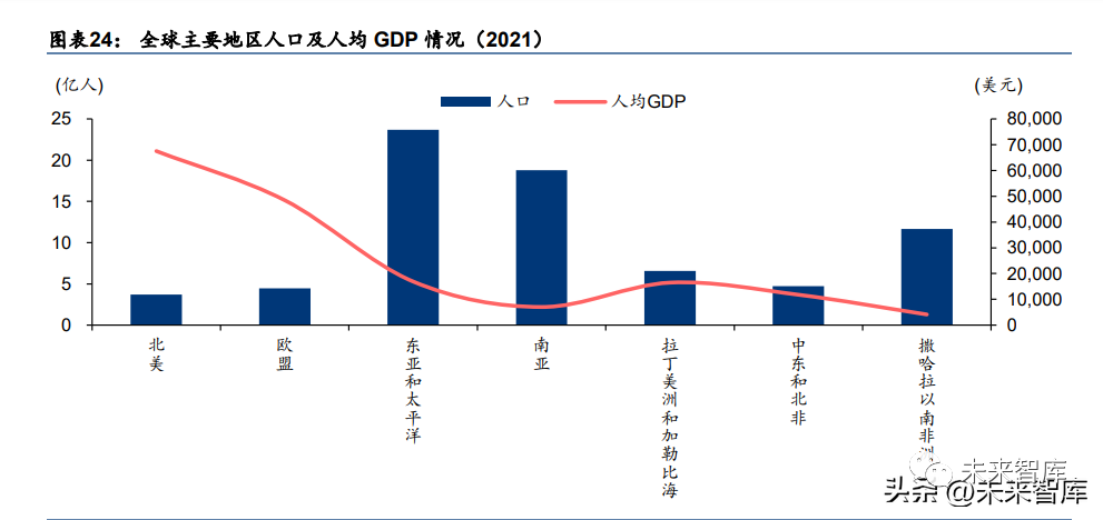 海外市場區域差異性大:成熟市場規模大,新興市場成長空間足。海外市場發展的空間來 自于更為廣闊的市場。居民收入及人口基數不但決定了市場規模,也決定了企業擴大規模、 追求成長的發展路徑。單一市場有限容量,企業難以實現規模效應的最大化。因此,不得 不進行全球范圍內的布局,實現更大的規模效應。根據世界銀行數據,2021 年北美人口 3.7 億人、歐盟人口 4.5 億人,在全球人口占比并不 高,但為全球最重要的成熟家電市場。在海外家電企業的發展路徑來看,由于人口基數的 限制,較快面臨本地用戶需求飽和,企業不得不進行國際化擴張。因此,BSH-博世西門子、 惠而浦、大金等等家電企業不得不從單一國家市場向區域發展,進而進行更為廣泛的全球 化擴張。
