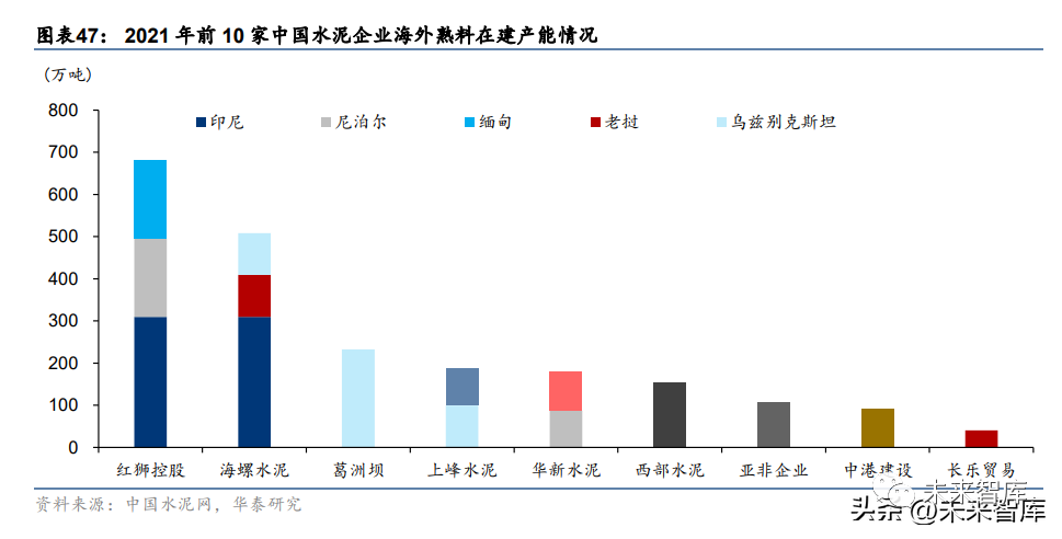 減量置換背景下,龍頭水泥企業出海逐步增多,以“一帶一路”國家為主。據中國水泥網 統計,截止于 2021 年底,中國水泥企業在海外已經投產水泥熟料產能 4502.6 萬噸,同比 +4.3%;在建水泥熟料產能 2185.5 萬噸,合計 5902.4 萬噸。其中,截至 2021 年底,海螺 水泥、華新水泥、紅獅控股分別已投產 1094.3、743.7、620 萬噸,占比 24%、16%、14%。截至 2021 年底,國內水泥企業海外在建熟料產能分布看,頭部企業仍有較大增量,且主要 集中在“一帶一路”國家。我們認為,水泥行業嚴禁新增產能且實行減量置換政策,除產線升 級和智能化改造以外,國內龍頭企業產能增長趨勢或外擴為主,且“一帶一路”國家固定資產 投資或仍有較大增長空間,有望帶來水泥的較大需求。