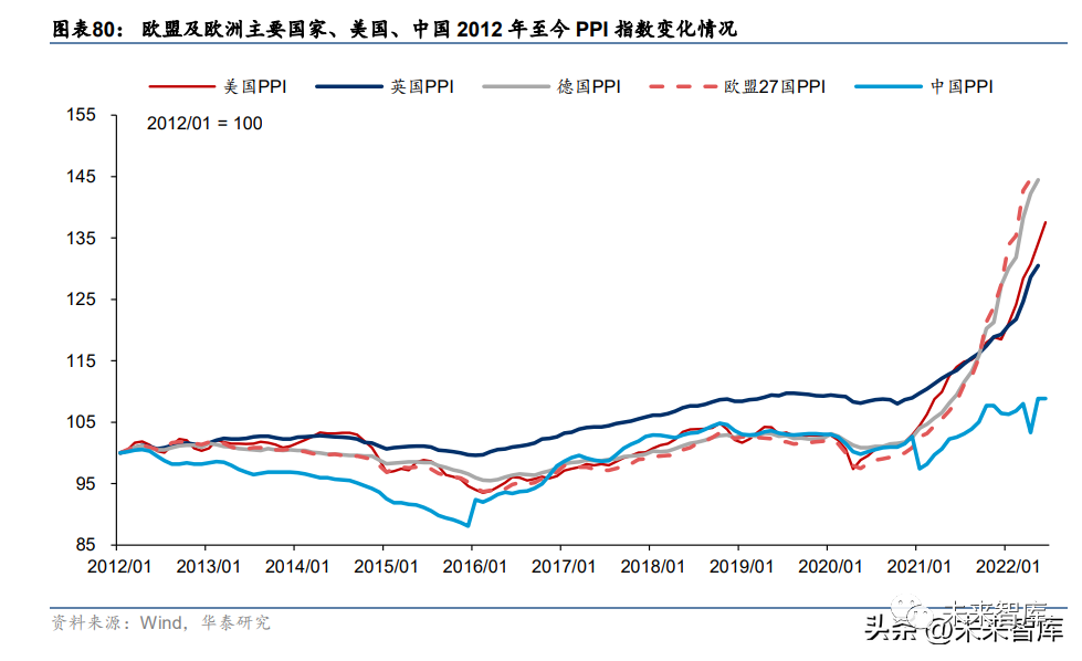 2020 年以來歐美等發達國家 PPI 指數一路上行。受經營環境及地緣政治影響,全球供應鏈 效率降低,原材料及燃料價格一路上行,人工效率降低等因素導致歐美等發達國家 PPI 指 數一路上行。2012 年 1 月為基期,截止 2022 年 5 月,美國/英國/德國/歐盟 27 國的 PPI 指數分別為 134/131/144/146,中國 PPI 指數僅為 109,體現出較強的成本端優勢。