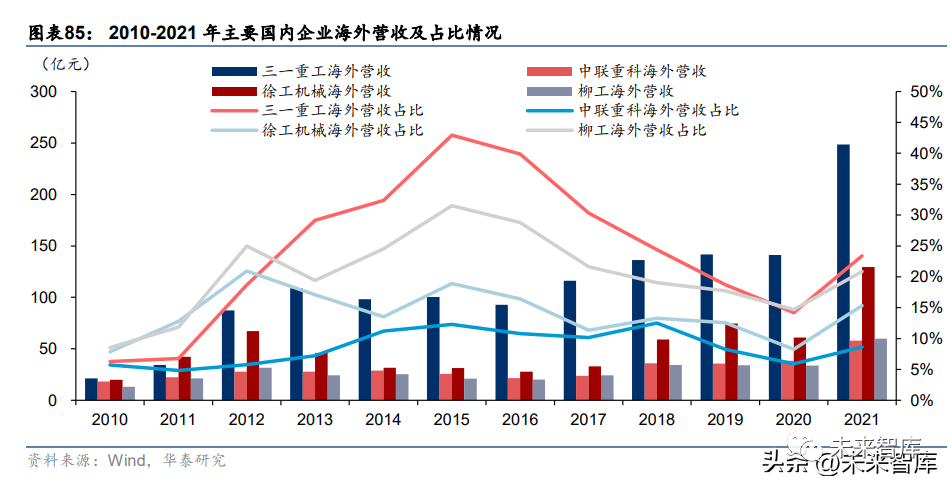 成本優勢顯著,中國工程機械企業出口額快速提升。本土龍頭公司的全球競爭力持續增強, 海外營收占比在 2021 年大幅提升。得益于中國穩定的供應鏈、海外市場景氣以及本土企業 持續提升的全球競爭力,三一、徐工、中聯、柳工等本土主要工程機械企業的海外營收占 比在 2021 年均大幅提升,其中三一 2021 年的海外營收占比已達到 23.41%。