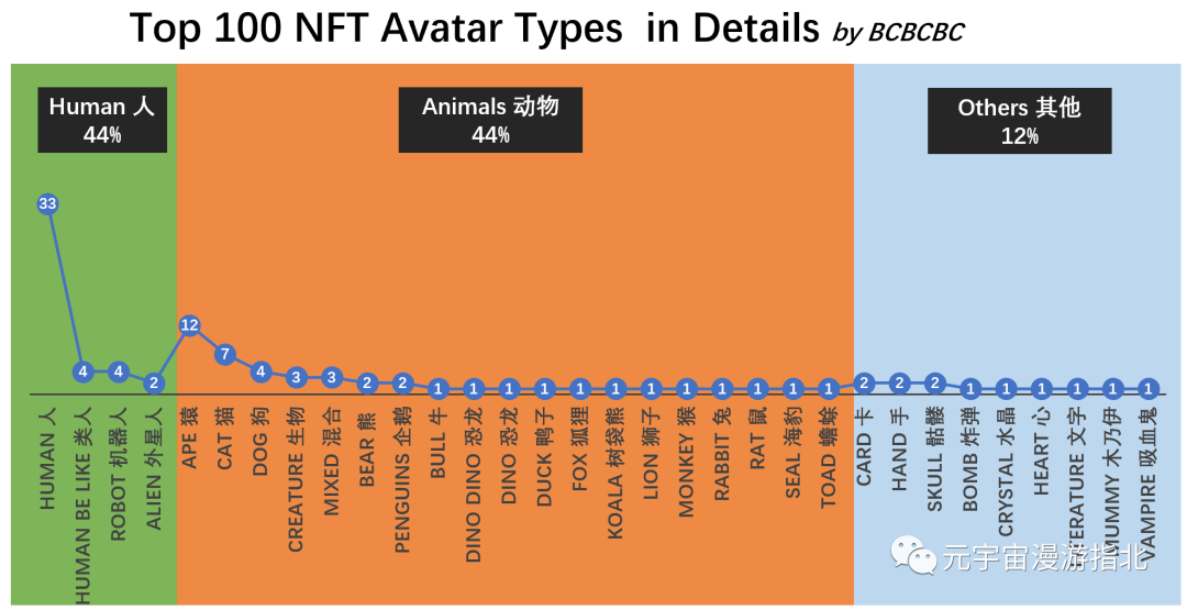 動物類,猿貓狗為大宗,也可以理解,BAYC把猿推向高峰,貓狗是大家最喜歡的寵物,除此之外還有超過十種以上的動物.....
