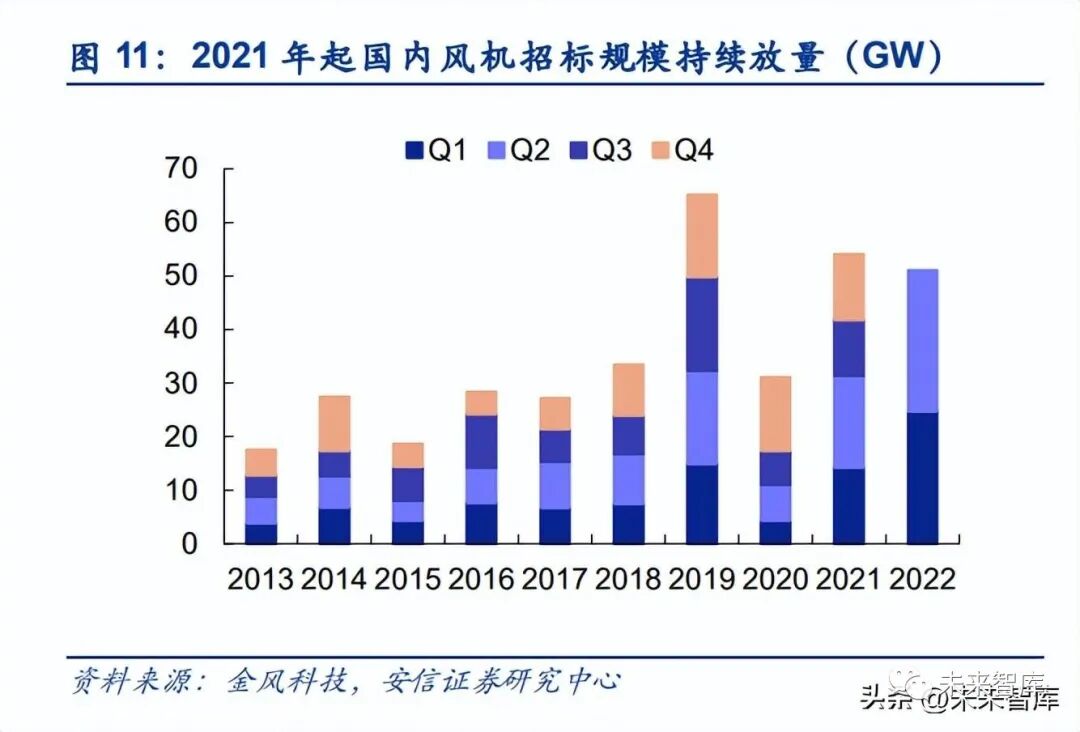 2022 下半年起國內大型風光項目建設進度有望明顯加快,配套儲能項目加速落地。2022 年 上半年受疫情、硅料緊缺、裝機成本高企等多方面影響,大型風光項目建設進度相對較慢, 上半年國內新增風電、地面光伏裝機僅為 12.9GW/11.2GW,與此前預期存在一定差距。考 慮到 2021 年以來國內風機招標持續放量,而光伏硅料的產出亦從四季度起實質性放量(七 八月份受檢修、限電、疫情等因素并未充分釋放),我們對 2022 年下半年以及 2023 年國內 大型風光項目裝機持積極態度,相應的配套儲能亦有望加速落地。
