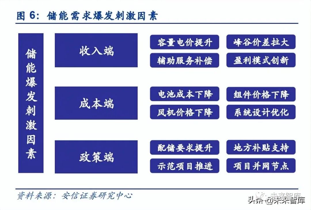 短期內新能源發電側儲能收益機制尚待建立,市場化是長期方向。目前國內新能源配套儲能 尚無明確收益模式,投資業主更多把配套儲能作為額外的成本項進行考慮,我們認為打通新 能源配套儲能項目經濟性的關鍵在于建立市場化的收益補償機制。2022 年 1 月國家發改委、 能源局發布的《加快建設全國統一電力市場體系的指導意見》已明確提出 2025 年初步建成 全國統一電力市場,初步形成有利于新能源、儲能等發展的市場交易和價格機制。具體到新 能源配套儲能項目而言,推動新能源參與電力市場交易、推進電力現貨市場建設、持續完善 電力輔助服務市場等改革方向都將擴大儲能項目在電力市場中的收益來源與套利空間,助力 儲能項目自身經濟性的提升。
