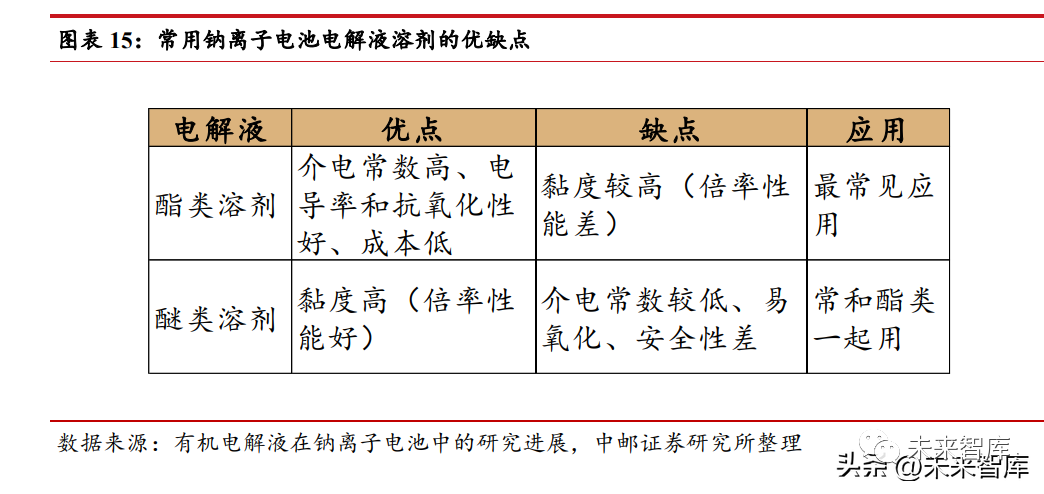 (2)醚類電解液可以提升電池的能量密度,但穩定性較差。醚類電解液的成分主要為 DME(乙二醇二甲醚)和 DOL(二氧五環)等,醚類電解液可以促進鈉離子在炭材料層間的 插入,有助于提升材料的比容量、首效和倍率性能。但是醚類電解液容易生成過氧化物,耐氧 化性差,應用時容易起火,安全性差。
