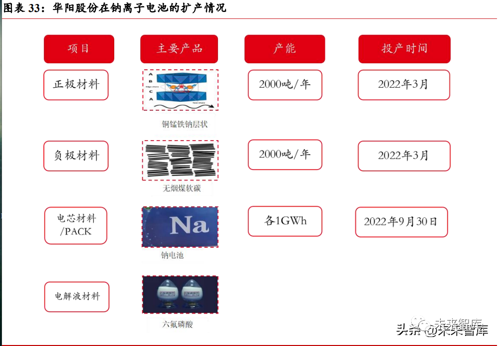 2021 年鈉離子電池持續穩步發展:3 月華陽股份受讓陽煤智能制造基金,投資“北京奇峰”、 “中科海鈉”項目,分別涉及飛輪儲能、鈉離子電池業務,其中持有中科海鈉 15.56%的股權;到 3 月底,由華陽股份母公司華陽新材料與中科海鈉、開源資產合作建設的山西新陽清潔能源項 目第一條鈉離子電池生產線試生產,該項目擬投資 2.8 億元,建設年產圓柱鋼殼鈉離子電芯 4000 萬只、方形鋁殼鈉離子電芯 400 萬只的兩條生產線;4 月 13 日,公司發布公告,旗下子 公司新陽能源擬投資不超過 1.4 億元,與中科海鈉成立合資公司,共建鈉離子電池正負極材料 4000 噸,約 0.8Gwh 的容量,其中,正極為鈉銅鐵錳氧化物,負極為無煙煤軟碳,而華陽股份 是國內最大的無煙煤上市公司,目前無煙煤年產能 4170 萬噸;6 月,華陽股份與中科海納共 同開發出了 1MVh 鈉離子電池儲能系統,已正式投運;9 月,華陽股份與多氟多、天津梧桐樹 擬就六氟磷酸鈉、六氟磷酸鋰以及電解液添加劑、負極材料等項目展開合作;華陽股份持續挖掘鈉離子電池潛能:9 月 30 日,公司發布公告,公司的全資孫公司華鈉 芯能投資建設的鈉離子電芯生產線設備安裝調試已完成,預計建設 1GWh 鈉離子電池電芯及 PACK 產線,這為鈉離子電池產業高質量發展奠定了扎實基礎;與中科海納預計在 2023 年共 同擴產 2000 噸鈉離子電池正負極產線。