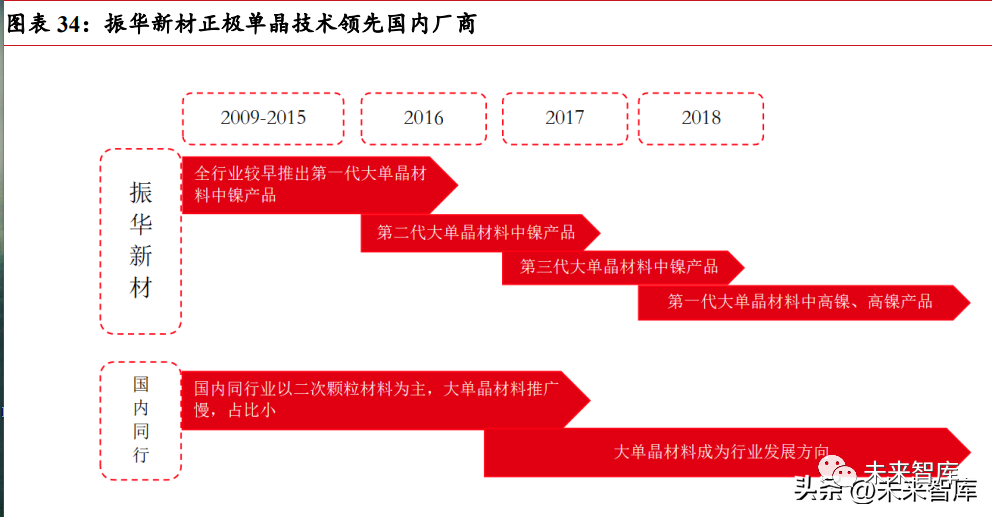 振華新材專注于正極材料的研發。公司于 2004 年成立,自成立以來專注于鋰離子電池正 極材料的研發、生產及銷售,主要提供新能源汽車、消費電子及儲能領域產品所用的鋰離子電 池正極材料,包括中鎳、中高鎳、高鎳、超高鎳在內的多種型號一次顆粒大單晶鎳鈷錳酸鋰三 元正極材料(NCM)。公司前瞻性布局層狀氧化物路線的鈉離子電池正極材料:目前已向主要客戶送樣和小批 量出貨,截止 2022 年 6 月 30 日,公司已具備鈉離子電池正極材料的產業化條件。公司鈉離子 電池正極材料是層狀氧化物路線,目前已經升級為第二代產品,已向客戶送樣,同時也部分小 規模產出并銷售。第二大產品相較于第一代,在克容量、首效、堿度控制上均有改善提升。振華新材正極單晶技術領先國內廠商。公司于 2009 年推出第一代 NCM523 單晶三元產 品,后續又于 2016 年、2017 年分別推出第二、第三代 NCM523 單晶三元產品,在繼承高安全 性和循環穩定性的基礎上提升比容量,降低內阻。2018 年公司推出 NCM613 單晶產品,2019 年推出 NCM811 單晶產品,成為國內較早具備高鎳一次顆粒大單晶三元正極材料批量生產、 銷售的正極材料企業之一。相較國內同行業競爭對手具備顯著領先優勢。