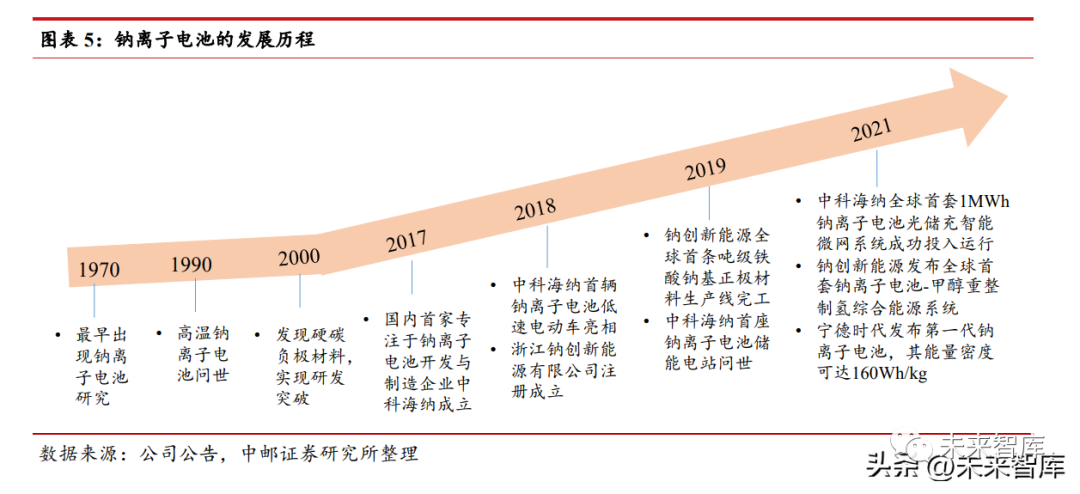 硬碳負極的研發,鈉電池逐漸走向成熟。1970 年到 1980 年間,整個鈉電行業處于研發階 段,開始出現高溫硫鈉電池以及 NaMeO2 正極;1980 到 1990 年,開始將鈉電應用到動力和儲 能方面,發明了高溫鈉離子電池,但此時缺乏穩定的負極;1990 到 2000 年,儲能應用研發逐 漸減少,鈉電研發進程放緩,轉而鈉-氯化鎳電池開始發展;從 2000 年發現硬碳負極材料開始, 整個鈉電行業實現了研發突破。國內鈉電池進展迅速,已經進入商業化前夕。2010 年,中科院開始發現鈉離子電池,成 為國內最早涉及該領域的組織機構;2017 年,國內首家專注于鈉離子電池開發與制造的企業 中科海納成立;2018 年,中科海納首輛鈉離子電池低速電動車亮相,同年,浙江鈉創新能源 有限公司注冊成立;2019 年,鈉創新能源全球首條噸級鐵酸鈉基正極材料生產線完工,同年, 中科海納首座鈉離子電池儲能電站問世;2021 年,中科海納全球套 1MWh 鈉離子電池光儲充 智能微網系統成功投入運行,同時期,鈉創新能源發布全球首套鈉離子電池-甲醇重整制氫綜合能源系統,而且寧德時代發布第一代鈉離子電池,其能量密度可達 160Wh/kg。