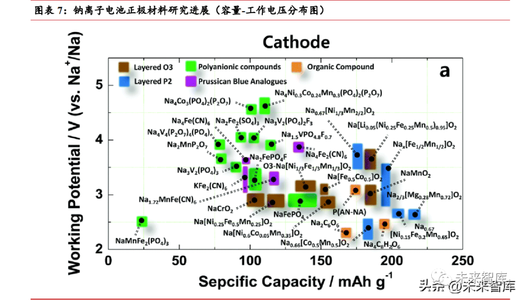 鈉離子電池主要的正極材料有過渡金屬氧化物、普魯士藍,聚陰離子等。正極材料是影響 電池能量密度、循環壽命等關鍵組部件,優秀的鈉離子正極材料應該具備:(1)原材料成本低, 制備工藝簡單,更好的發揮鈉離子電池成本低的優點;(2)具有氧化還原電對并且氧化還原電 位夠高,有利于提高鈉離子電池的能量密度;(3)電子和離子傳導速率高,能實現快速的充放 電;(4)材料結構穩定性高,在鈉離子脫嵌過程中結構不發生相變或相變可逆性高。目前研究的最多的正極材料主要是以下三種:過渡金屬氧化物、普魯士藍/白化合物,聚陰離子。