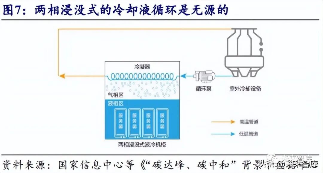 浸沒式液冷可將數據中心 PUE 降低至 1.2 以下,優于風冷和冷板式液冷。對比 不同制冷方式,浸沒式液冷冷卻液和發熱設備充分接觸,散熱效率更高,可將數據 中心 PUE 降低至 1.2 以下,運行更穩定,同時由于沒有風扇,噪音更低,符合國家 發改委對數據中心建設的政策指導目標,是未來數據中心基礎設施建設的發展方向。兩相浸沒液冷的能耗低于單相浸沒液冷。數據中心浸沒式液冷技術的能耗主要 由促使液體循環的泵和室外冷卻設備產生,根據冷卻液換熱過程中是否發生相變可 分為單相浸沒式液冷與兩相浸沒式液冷。其中,兩相浸沒式的冷卻液循環是無源的, 因此兩相浸沒液冷的能耗一般要低于單相浸沒液冷。由于浸沒式液冷的室外側通常 是高溫水,其室外冷卻設備往往可以利用自然冷源且不受選址區域的限制,從而起 到節能減排的目的。