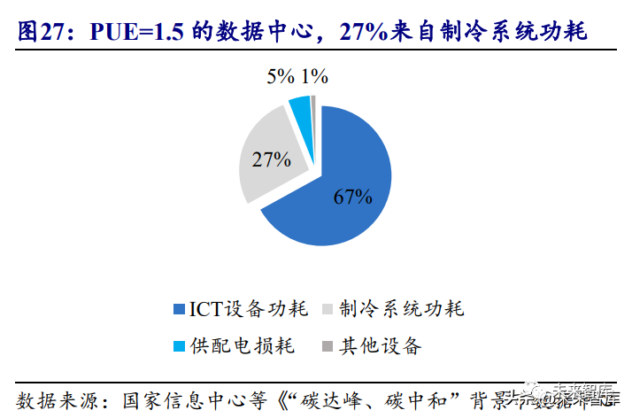 預計到 2025 年全球數據中心平均功率達到 25kW。數據量的大規模增長需要海 量服務器以支撐大量的計算能力,受限于數據中心建設面積和環保規定,增加單機 柜功率成為調和不斷增長的算力需求和有限的數據中心承載能力的關鍵解決方案。據賽迪顧問預測,快速增長的數據中心算力將推動高功率單機柜快速普及,預計到 2025 年全球數據中心平均功率達到 25kW。PUE=1.5 的數據中心,27%來自制冷系統功耗。大量數據吞吐和運算使得作為 新興技術“大腦”的數據中心面臨巨大的能耗和散熱挑戰。一方面,服務器等 IT 設 備的計算、存儲功耗龐大;另一方面,冷卻數據中心 IT 設備的功耗也在快速增長。以一個 PUE=1.5 的數據中心為例,其中 67%的電力消耗來自 ICT 設備功耗,27%來 自制冷系統功耗,5%功耗由供配電損耗和 1%由其他設備產生。