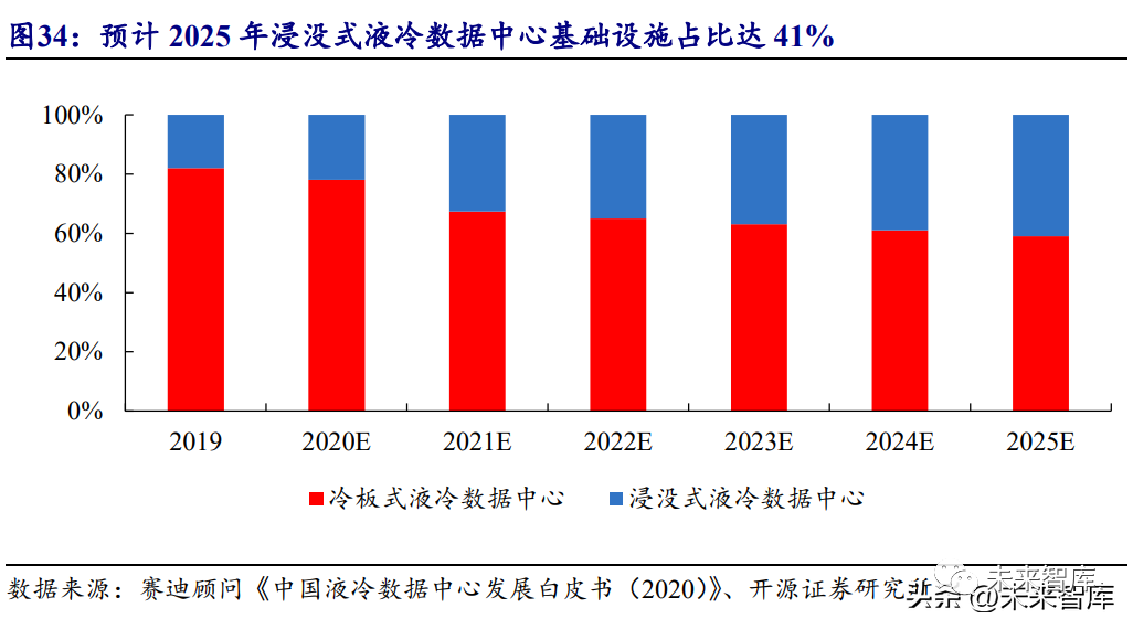 細分市場來看,預計浸沒式液冷數據中心基礎設施占比會持續擴大。2019 年, 冷板式液冷數據中心基礎設施和浸沒式液冷數據中心基礎設施占比分別為82%、18%。冷板式液冷技術發展較早,目前冷板式液冷數據中心產品在市場上占比較高,但浸 沒式液冷是直接接觸的制冷方式,相較于冷板式液冷,更大程度上利用液體的比熱 容特點,制冷效率更高,可以更有效降低數據中心 PUE,未來浸沒式液冷數據中心 基礎設施將會占據更多市場。據賽迪顧問預測,2025 年,浸沒式液冷數據中心基礎 設施占比預期提升至 41%。