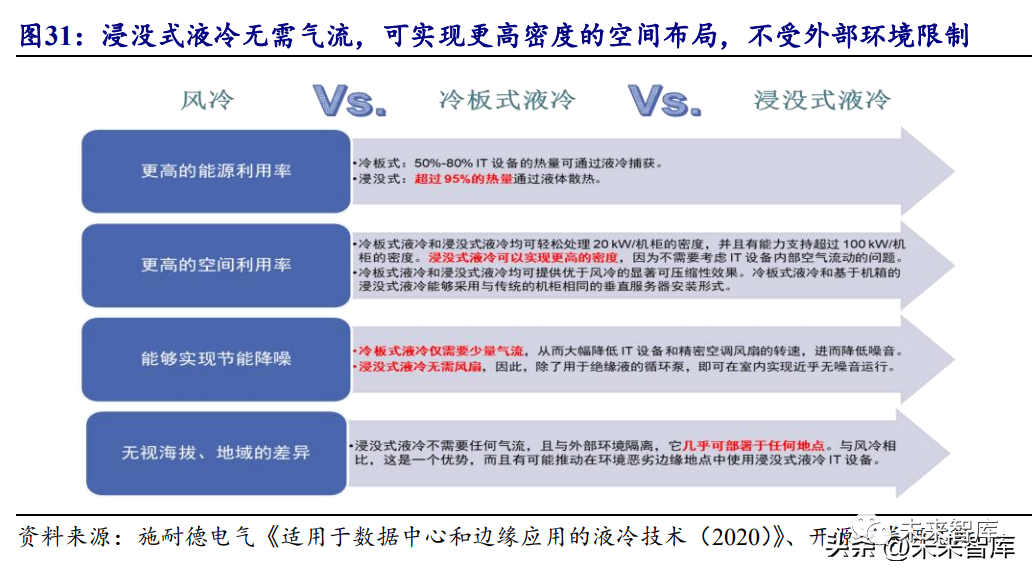 相比傳統風冷技術,液冷技術的技術優勢主要體現在一下幾個方面:(1)更高的能源利用率。由于液體具有較高的導熱率和比熱容,更夠更快地傳 導以及更有效地吸收熱量,能夠保障 CPU 在一定范圍內進行超頻工作不會出現過熱 故障,有效提升服務器的適用效率和穩定性。(2)更高的空間利用率。液冷數據中心省卻空調系統和相應基礎設施的建設, 無需安裝冷熱通道封閉設施,更不需要架空地板,節省了大量的空間,從而能夠在 單位空間布置更多的服務器,提高數據中心運算效率。因此液冷技術比傳統冷卻方 式具有更高的空間利用率。