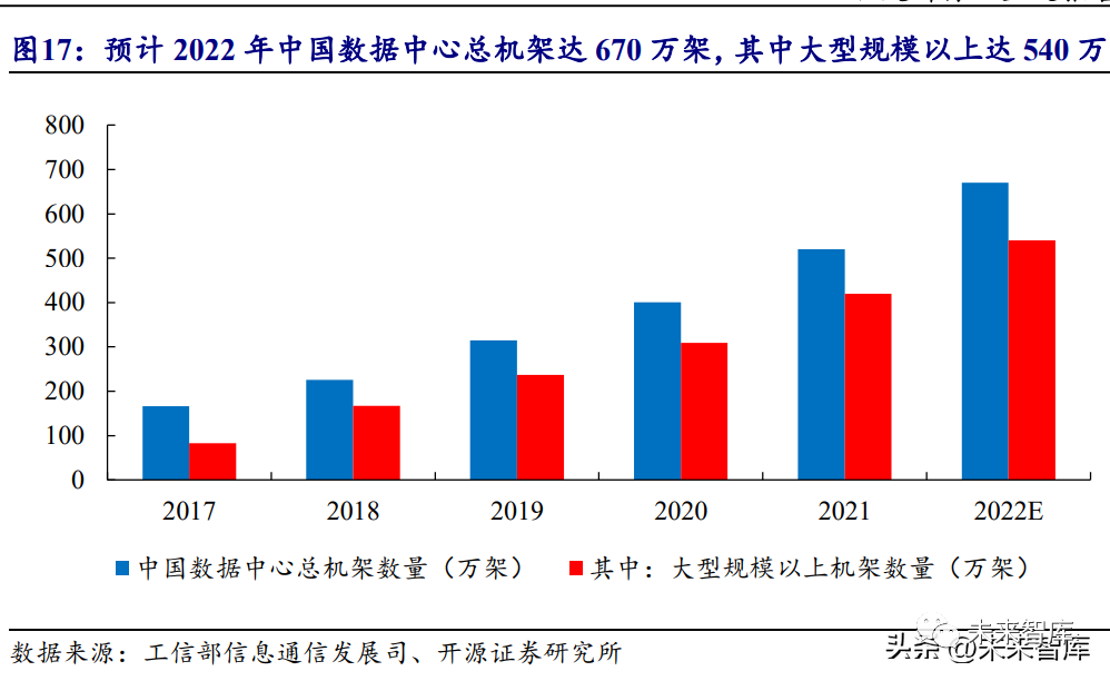 預計到 2023 年底全國數據中心機架規模 CAGR 約 20%。從產業規模上來看, 數據中心的產業規模快速增長。根據中國信通院的數據顯示,2021 年,中國數據中 心在用機架數量達到 520 萬架,較 2020 年增加超過 100 萬架。《新型數據中心發展 三年行動計劃(2021-2023 年)》指出,到 2023 年底,全國數據中心機架規模年均增 速保持在 20%左右,預計到 2023 年,中國數據中心在用數量超過 800 萬架。數據中 心機架數量的持續增長表明數據中心產業的整體規模不斷擴大,同時反映數據中心 基礎設施產業不斷發展。