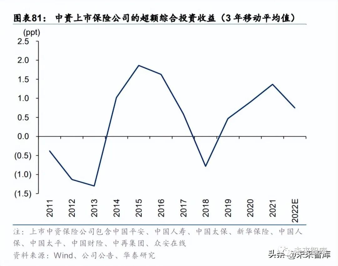 盡管凈投資收益率面臨下行壓力,保險公司積極運用權益投資來獲取超額收益。綜合投資 收益率是衡量保險公司投資表現最全面的指標,在凈投資收益率的基礎上還包括了進入利 潤表和其他綜合收益的投資價差收益。總投資收益率則處于前兩者之間,在凈投資收益率 的基礎上加上進入利潤表的投資價差收益,但不包括歸屬于其他綜合收益的價差收益(通 常所說的浮盈浮虧)。2017 年似乎是投資收益率的分水嶺。在此之前,凈投資收益率、總投資收益率和綜合投 資收益率都處在上行周期。2017 年后,凈投資收益率逐漸下滑,總投資收益率和綜合投 資收益率在 2018 年遭受重創,但之后的震蕩上行表明保險公司近些年已經能較好的控制 權益投資風險。因為凈投資收益率很難達到 5%的長期投資收益假設,所以這部分超額收 益是保險公司獲得 5%投資目標的關鍵。超額收益率是綜合投資收益率超出凈投資收益率 的部分,從近幾年的趨勢看,保險公司獲得超額投資收益的能力也在不斷增強。