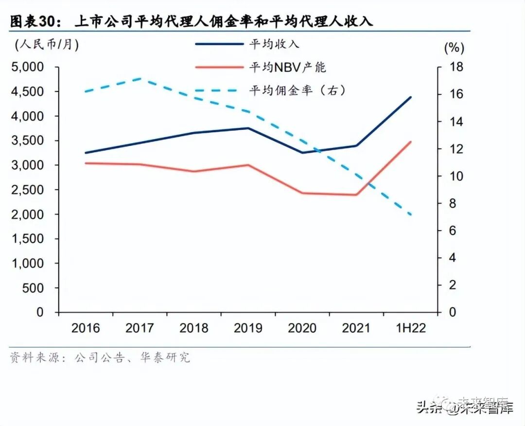 我們根據上市公司在 2022 年上半年的披露的財務數據估算了各家公司的代理人收入,結 果發現中國平安和中國人壽的代理人傭金收入領先行業(RMB6,000/月左右),中國太保 和中國人保居中(RMB3,000-3,500/月),中國太平和新華保險則在 RMB2,000/月左右。中國平安的代理人通過交叉銷售還能獲得 RMB1,600/月的額外收入,使其總收入超過了社 會平均工資。僅靠傭金收入,上市公司的代理人目前尚未能達到社會平均工資的水平,且 各家公司之間的分化較大。我們認為代理人的平均收入應該至少達到社會平均工資水平才 能吸引優秀人才進入壽險。能夠獲得社會平均收入,從事保險銷售才是一個可持續的工作, 才能確保代理人隊伍的穩定和保費持續增長。
