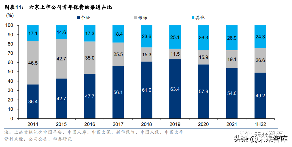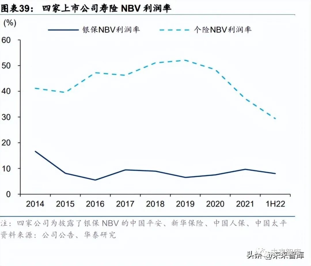 銀保渠道的重要性在外部環境變化期間得到凸顯,2020 年以來新單保費和 NBV 皆實現正 增長。2020 年的外部環境變化使得個險渠道的代理人線下展業困難重重,保險公司通過 銀保渠道和互聯網渠道的新單增長部分抵消代理人渠道展業受阻帶來的負面影響。隨后的 2021 年和 2022 年上半年,銀保渠道的新單保費也維持了較為穩健的增長。部分公司在業 績會上提到,保持銀保渠道新單增長是出于維護保險公司與銀行的合作關系的考量。盡管 銀保產品利潤率低于個險渠道,但是我們觀察到四家上市公司的銀保利潤率在 2019 年至 2021 年呈現出上升的趨勢,可能是受益于新單保費結構中期繳產品和保障型產品占比的 增加。銀保渠道的經營模式正在改變,頭部壽險公司開始嘗試新的銀保戰略。過去傳統的銀保合 作模式中,保險公司簡單的通過銀行柜臺銷售簡單類似萬能險的高利率壽險產品。這已不 能適應當下商業銀行增加中間業務收入的需求,所以銀行正在探尋與保險公司更深入的合 作,以滿足高凈值客戶的需求,從而達到利潤和價值的最大化。頭部上市公司正在試點與 銀行新的合作方式,中國平安的銀行優才渠道已經擴充至 1,000 人,專注于高凈值客戶為 主的市場,其產能是壽險鉆石團隊的 1.4 倍;中國太保與銀行一同思考如何挖掘客戶的潛 在價值,專注為私人銀行客戶提供更多的產品服務,比如將一些個險渠道諸如健康和養老 的附加服務引入銀保渠道,以滿足客戶的多元化需求。過去五年來,四家上市公司的銀保 NBV 利潤率(APE)最高達到 9.7%,但仍低于代理人渠道 30%-40%的利潤率。我們認為 隨著中資公司與銀行合作模式的深入,銷售產品可能會從簡單的理財產品逐步切換到保障 型產品,這有望提升未來銀保渠道的 NBV 利潤率。