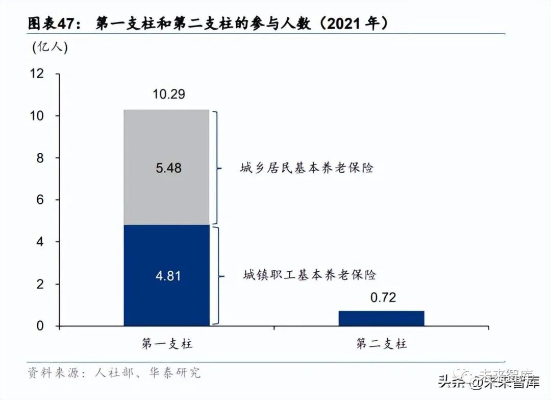 目前的中國的養老保險體系由第一和第二支柱主導。截至 2021 年底,第一支柱積累了 11.1 萬億基金規模,包含基本養老保險 6.4 萬億,覆蓋 10.3 億參保人。此外,第一支柱還 包含社保基金理事會管理的 4.7 萬億,其中 3.0 萬億為社保自有基金,1.7 萬億為國務院劃 轉的中央企業國有股權。第二支柱積累了 4.4 萬億企業年金和職業年金,覆蓋 7,200 萬參 與者。第三支柱的發展遠遠滯后于第一和第二支柱,在個人養老金制度出臺之前缺乏清晰 的發展方向和整體規劃,體現為金融產品層面的局部創新。此次的個人養老金安排對第三 支柱進行了制度層面的規劃,明確了第三支柱的內涵和外延,是養老保險第三支柱的頂層 規劃,指明了未來的發展方向。我們認為未來的養老保險第三支柱將由個人養老金主導。
