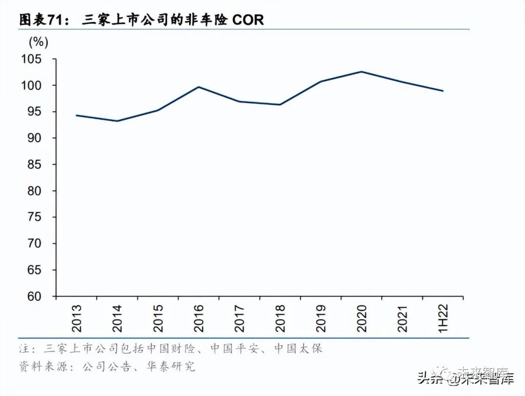 過去幾年,非車險的快速發展部分抵消了車險增速疲弱的影響,但是市場競爭也日趨激烈。隨著車險成為了拖累總保費增長的原因,財險行業加大了非車險的投入,希望通過非車險 的高速增長抵消車險的疲弱。2017 年至 2019 年期間,六家上市公司的非車險業務實現了 超過 25%的保費增速。2020 年的外部環境導致出行相關險種的增速疲弱,期間的信用風 險飆升也讓行業主動壓降了融資類信用保證險的規模。受此影響,六家上市公司非車險保 費同比增速下滑至 7.4%。由于中小公司涉足政策型業務的難度較大,它們轉而投向商業 非車險中的健康險業務,導致商業健康險市場的競爭日趨激烈,渠道費用率的節節攀升壓 縮了商業健康險的承保利潤空間。政策型業務的“保本微利”原則以及頻發的自然災害導致非車險 COR 維持在高位。三家 頭部上市公司(中國財險、中國平安、中國太保)的非車險 COR 在 2019 年以來均保持在 100%之上,這既有政策型業務利潤微薄的原因,也有下半年頻發自然災害的影響。政府 對于大病險和農險等政策型業務的基調是“保本微利”,因此這些業務線利潤微薄,難以 對整體盈利帶來實質性的支撐。此外,2019 年以來,每年三季度的的臺風、洪水和暴雨 等自然災害也給企財險、責任險以及農險等業務線造成了較高的賠付率。另外,融資類信 用險在 2020 年的賠付增加也使得非車險的承保表現雪上加霜。
