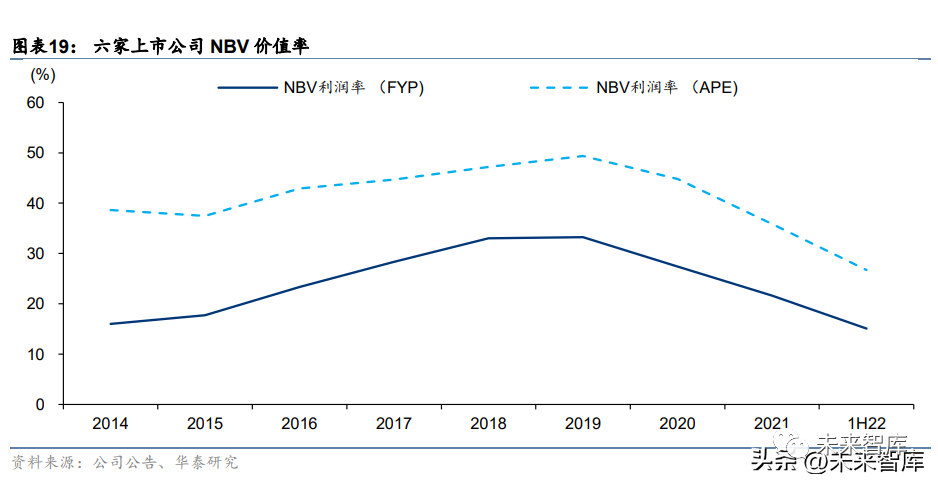 中國人壽在 2022 年下半年正式提出了“眾鑫計劃”。“眾鑫計劃”是一個專項提優項目, 主要目的也是加快隊伍的專業化、職業化轉型。具體的舉措包括升級銷售隊伍管理辦法, 聚焦新人、主管和績優群體,強化業務品質管理;科技賦能銷售及隊伍管理,通過數字化 平臺加強線上培訓及風險合規教育,有序恢復銷售隊伍活力,推動隊伍建設高質量發展。中國人壽表示“眾鑫計劃”的門檻相對強調學歷背景,需要大專以上的學歷,下一步重點 增員對象的年齡鎖定在 25 歲至 45 歲之間。此外,公司還要求增員對象在當地有體面的工 作,足以證明其在社會上的生存能力。在日常經營中,公司會集中資源,對“眾鑫計劃” 代理人進行相應的支持,幫助它們在壽險行業中取得更好的發展。通過個險渠道的轉型升級,頭部壽險公司在 2022 年上半年實現了代理人 NBV 產能的同比 改善。盡管代理人產能已經出現了邊際提升,但是人力規模的大幅流失導致產能提升對 2022 年 NBV 的貢獻有限。我們預計 2022 年上市公司的 NBV 仍將出現同比負增長,但是 幅度將會收窄。具體來看,2022 年下半年的 NBV 同比表現將會好于 2022 年上半年,我 們預計部分公司甚至將在下半年錄得 NBV 的正增長。