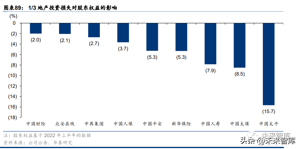 2022 年以來房地產領域震蕩的影響下,投資市場波動性顯著加大,房貸領域的風險事件 亦讓投資者對保險公司的投資端產生擔憂。截至 2022 年上半年,上市公司的地產投資風 險敞口在 3.0%-5.7%,我們認為仍處于可控的區間。假設地產投資遭受 1/3 的損失,對各 家保險公司股東權益的影響在 2-16%之間。考慮到各家保險公司 2022 年的 ROE 在 6%- 16%,1/3 地產投資損失會對部分公司當年收益的影響較大,但尚不會對股東權益和償付 能力造成嚴重沖擊。