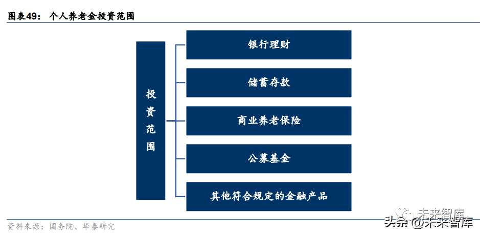 《個人養老金意見》引入個人養老金賬戶,這將成為第三支柱未來發展的基礎制度安排。個人賬戶制度使得參與者能夠真正實現“個人主導”其第三支柱的養老安排,便于拓寬合 資格的金融產品范圍和參與其中的金融機構,提升勞動者參與第三支柱養老安排的熱情。同時,個人賬戶制度和代扣代繳的個稅繳納制度也能夠有效銜接,便于參與者享受稅收優 惠,提升參與者獲得感。再次,個人賬戶制度也能夠有效控制個人養老金的提前支取,真 正做到為“養老”所用。《關于推動個人養老金發展的意見》發布后,各項配套政策也逐步出臺。2022 年 9 月 27 日國務院常務會議決定個人養老金稅前扣除限額為 12,000 元/年,投資收益暫不征稅,領 取收入的實際稅負為 3%,相較于之前稅收遞延養老保險 7.5%的平均領取稅率,有較大幅 度下降。3%是個稅繳納的最低檔稅率,換言之,任何繳納個稅的人參與個人養老金都至 少可以享受到稅收“遞延”的好處;如果繳納個稅的邊際稅率高于 3%,還可以享受到稅 收“減少”的好處。目前中國繳納個稅的人群為 6,000 多萬,如果其中一半的人參與個人 養老金并全額繳付 12,000 元/年的金額,則會帶來 3,000-4,000 億/年的資金流入。假以時 日,個人養老金積累的資金規模將非常可觀。