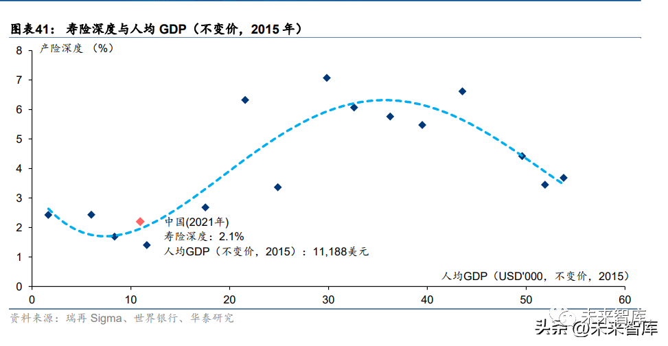 連續幾年的壽險新單保費負增長,使得市場開始質疑壽險行業在中國的長期發展空間。我 們認為這一段時間的負增長反映的是壽險行業在“規模擴張型”周期后半段,經營模式由 規模擴張轉向效率提升帶來的沖擊,并非是壽險需求的消失。我們認為無論是健康還是養 老,中國仍然面臨巨大的保障缺口,商業保險未來仍有相當的發展空間。我們對全世界 34 個國家 1999 年-2021 年的數據分析顯示,當人均 GDP(美元,不變價, 2015)超過 1 萬美元的時候,壽險保險深度進入快速提升階段。人均 GDP 從 1 萬美元上 升到 3 萬美元,壽險的保險深度會從 2%左右上升至 6%左右。也就是說這一階段壽險保費 增長速度超過了 GDP 增長速度,壽險呈現出加速發展態勢。我們認為這條曲線仍然有其 現實意義,當居民富裕之后,增加壽險保障以保護人力資本是歷史的大趨勢,中國的消費 者也不例外。中國的人均 GDP 剛剛超過 1 萬美元,我們認為只要中國的經濟繼續發展, 消費者就會購買越來越多的保險保障。