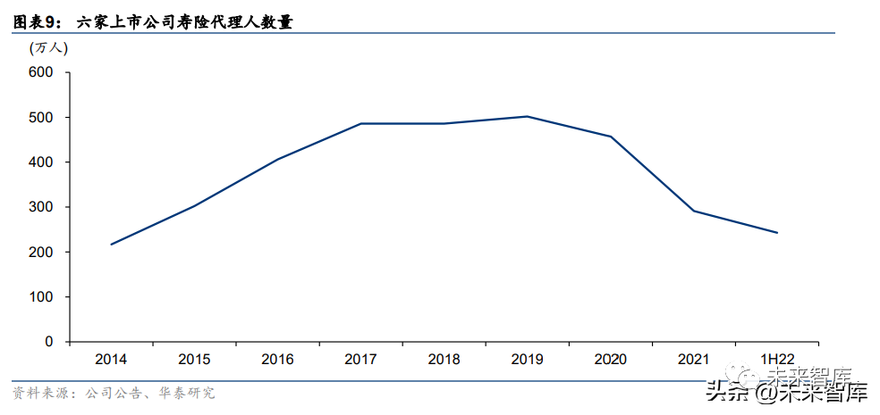 本輪周期最大的特征體現在代理人數量驅動業務增長。2015 年-2017 年是代理人擴張階段, 短短三年間,六家公司(中國平安、中國人壽、中國太保、新華保險、中國人保、中國太 平)合計代理人數量翻番;2018-2019 是代理人規模持平階段,代理人數量沒有明顯變化;2020 年至今是代理人收縮階段,截至 2022 年上半年,代理人數量較高點減半,接近 2014 年的水平。我們認為代理人轉型升級尚未完成,仍有相當部分代理人的收入遠遠低 于社會平均工資,因此代理人規模能夠在近期穩定下來的可能性不大。但代理人流失最快 的階段可能已經過去,未來的流失速度有望逐步趨緩。
