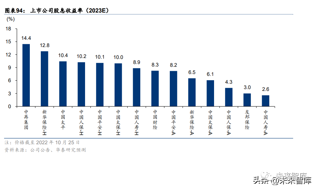 大部分上市保險公司均保持了 20%以上的分紅比率,眾安保險目前尚沒有分紅。我們預計 各家公司將維持目前的分紅比率。友邦保險和中國平安將股息與營運利潤掛鉤,保證了分 紅不受短期投資收益波動和折現率變動的影響。我們預計上市公司的 2023 年股息率在 2.6%-14.4%之間,我們認為具有吸引力,其中 H 股的股息率相對高于 A 股。
