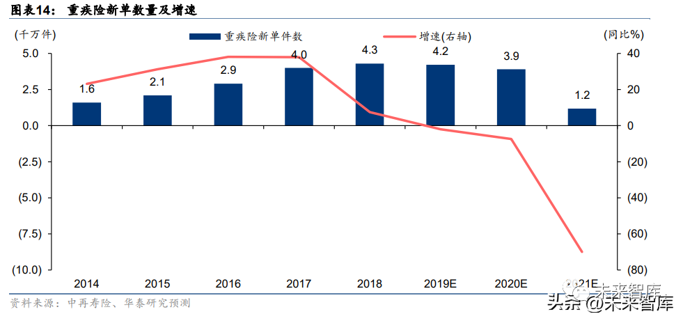 我們認為重疾險的早期紅利已經兌現,爆發式的增長難以重現。2014 年至 2020 年,我們 根據歷史數據估計重疾險的新單銷售數量從 1,600 萬單/年增長至 4,000 萬單/年。僅這 7 年間,我們估計中國市場上可能就銷售了 2.3 億張重疾險保單,如果拉長時間,累計銷售 的重疾險保單可能已經超過 3 億張。換言之,重疾險的潛在目標客戶可能絕大部分已經擁 有了一張重疾險保單,后續的增長來源于較少的新客戶以及老客戶的重復購買。因此我們 認為重疾險已經走過了高速發展期,而且這種快速增長在未來難以重現。