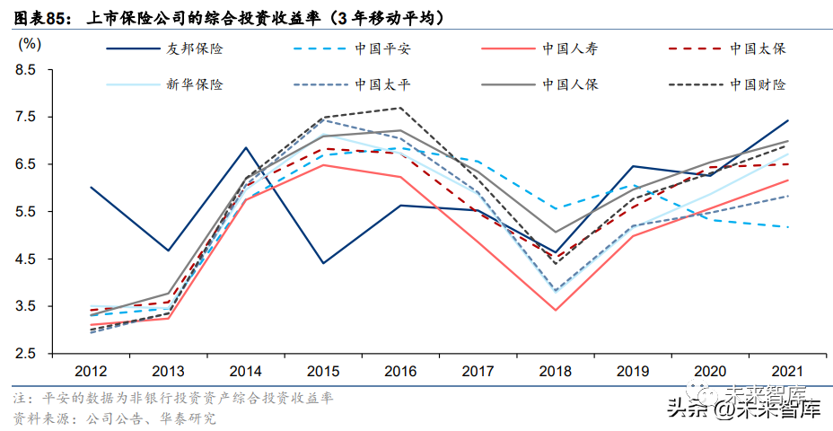 可供出售金融資產的浮盈浮虧的計入加大了綜合收益率的波動幅度。目前的會計準則 (IAS39)下(中國平安除外,該公司已經切換至 IFRS9 準則),保險公司可以通過“可 供出售金融資產”科目隱藏投資的利潤和虧損。正因如此,全口徑的綜合投資收益率可以 更好的反映保險資金投資的真實情況。我們觀察到,綜合投資收益率呈現出比總投資收益率更大的波動幅度。上市公司在 2012 年 2014 年間的表現都非常接近,但是分化發生在 2015 年,中國人保和中國財險實現領先 行業的收益率,我們認為財險業務占比大導致的權益配置比例高可能是原因之一。友邦保 險的綜合投資收益率表現也在 2018 年領先于中資公司。我們認為合適的權益配置比例和 出色的投資管理能力是保險公司獲取超額投資收益的兩個必備條件。
