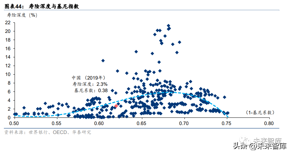 黨的二十大提出全面建成社會主義現代化強國的奮斗目標,“實現全體人民共同富裕”是 其中的重要內容。我們理解降低貧富差距,將是未來重要的政策導向。從世界經驗來看, 降低貧富差距對保險行業有著正面的促進作用。我們分析了 OECD 國家基尼系數和保險深度之間的相關關系。基尼指數是國際上通用的、 用以衡量一個國家或地區居民收入差距的常用指標之一。基尼系數最大為 1,最小等于 0。基尼系數越接近 0 表明收入分配越是趨向平等。35 國家 22 年的數據顯示,當基尼系數為 30%-35%的時候(這個區間被視作貧富分化程度中等),保險深度最高。基尼系數高于或 者低于這個區間,保險深度都會降低。或者說,在收入分配適度公平的經濟體內,對保險 的需求最為旺盛。2019 年,中國的基尼系數為 0.38(世界銀行口徑),同期壽險深度為 2.3%。我們認為隨著貧富差距進一步收窄,消費者對保險的需求會進一步上升。