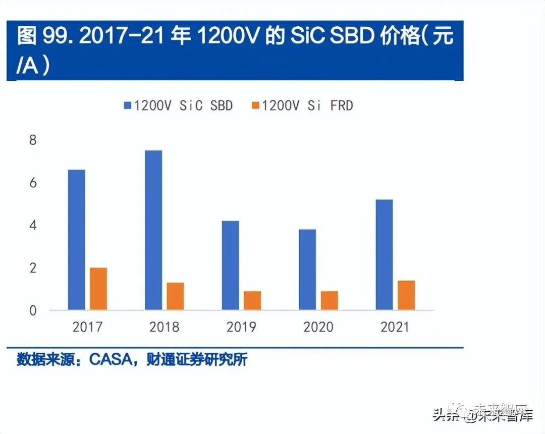 SiC 器件預計 2023-25 年可達到合理性價比。根據 CASA 的跟蹤,SiC 產品 價格近幾年來快速下降,較 2017 年下降了 50%以上,而主流產品與 Si 產品的 價差也在持續縮小,已經基本達到 4 倍以內,部分產品已經縮小至 2 倍,已經達 到了甜蜜點。加上考慮系統成本(包括周邊的散熱、基板等成本)和能耗等因素, SiC 模組已經有一定競爭力。