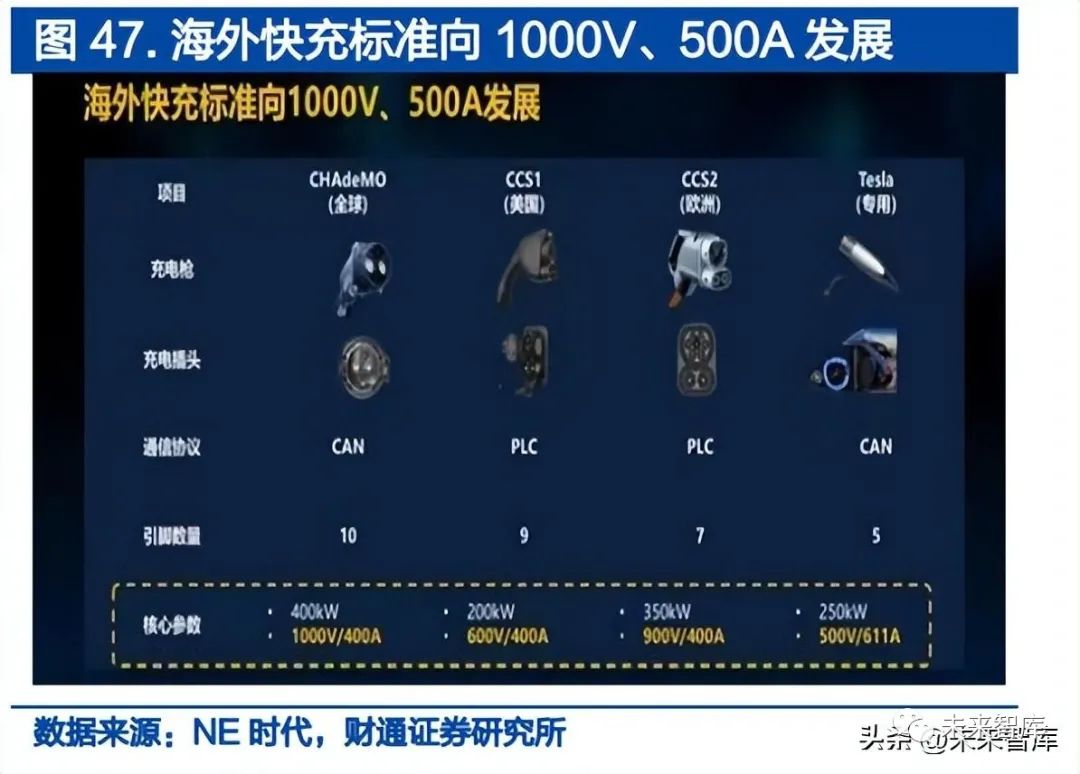 更高功率、更多數量的超充站布局。截至 2022 年 6 月,特斯拉在中國大陸已建 立 1200 多座超級充電站,8700 多個超級充電樁,其 V3 充電樁功率為 250kW, 未來還將推出峰值充電功率 350kW 的 V4 充電樁;小鵬汽車 22 年 8 月發布峰 值充電功率為 400kW 的 S4 超快充樁,計劃到 23 年新增超過 500 座以上、到 25 年累計建設 2000 座超快充站。此外,2022 年 7 月中國主導發起的 ChaoJi 直流充電接口標準在 IEC 全票通過,有望促進超級充電基礎設施加速布局。