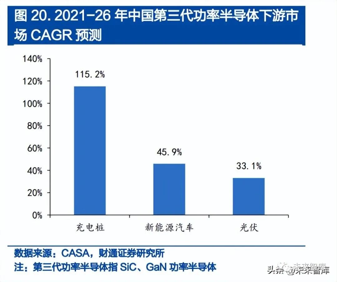 根據 Yole,新能源汽車、光伏儲能是 SiC 市場增長的主要驅動力。1)全球新能源汽車 SiC 功率器件市場規模 2019 年為 2.3 億美元,占比為 41.6%, 2021 年 6.8 億,占比為 62.8%,預計至 2027 年增加至 49.9 億美元,占比提 升至 79.2%,2021-27 年 CAGR 為 39.2%。2)光伏儲能是 SiC 功率器件第二大應用市場,2021 年該全球市場規模為 1.5 億美元,預計至 2027 年增加至 4.6 億美元,2021-27 年 CAGR 為 20.0%。據 CASA 預測,2021-26 年中國第三代半導體電力電子市場將保持 40%年均 增速,到 2026 年市場規模有望達 500 億元。其中,車用第三代半導體市場將從 40.5 億元增長至 267.3 億元;充電樁用第三代半導體市場從 0.54 億元增長至 24.9 億元;光伏用第三代半導體市場從 5 億元增長至 20 億元。