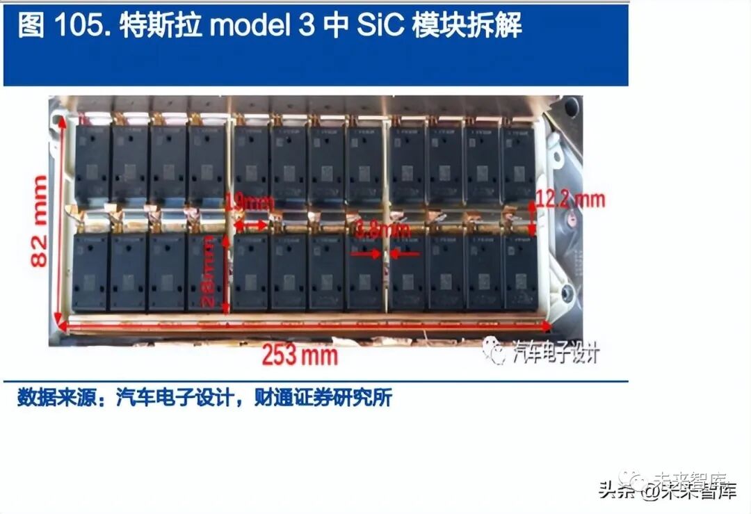 SiC MOS 在主驅上車預計和 IGBT 方式類似,模塊及單管并聯同時存在:國外特斯拉 model3 主逆變器選用 SiC MOS 單管并聯方案。特斯拉的 Model3 是第一個應用碳化硅(SiC)功率元器件的電動車型,供應商選用來自 ST 的 650v SiC MOSFET。Tesla 的 TPAK(TeslaPack)用在主驅逆變器電力模塊上共 24 顆,采用單管并聯方式排布,拆開封裝每顆 TPAK 有 2 個 SiC 裸晶(Die), 共 48 顆 SiC MOSFET。