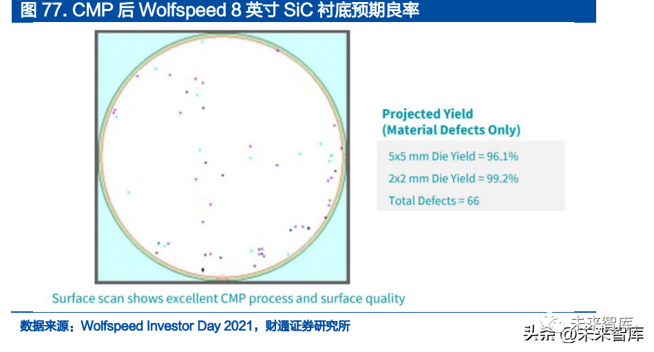 3)減少損耗、良率提升促 SiC 成本下降。目前主流商用的 PVT 法晶體缺陷控 制難度大導致襯底良率低,各廠商通過技術投入研發逐年提升 SiC 襯底良率。例 如天岳先進設計不同尺寸 SiC 單晶生長爐,對坩堝、保溫進行了設計,實現了均 勻熱場結構,提升晶體質量和良率,其 SiC 襯底良率近年來保持在 70%以上。Wolfspeed 的 8 英寸 SiC 襯底良率在經過化學機械拋光(CMP)后預期良率在 95%之上,因此擁有產品定價權。隨著襯底廠商完成低缺陷密度單晶生長工藝及 厚單晶生長工藝研發后,襯底單位面積價格將會快速的下降。