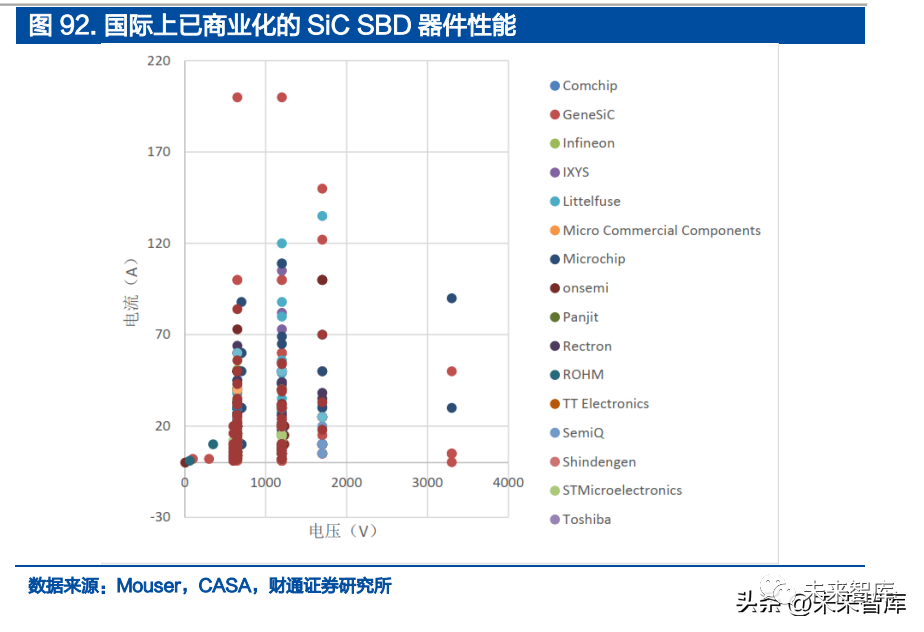 中高壓二極管產品逐年增多。Mouser 數據顯示,2021 年共有 828 款 SiC SBD 產品在售,較 2020 年新增約 30 款,中高壓商業化產品逐年增多。其中,80% 以上的產品耐壓范圍集中在 650V 和 1200V;1700V 的 SiC SBD 產品達到 31 款,與 2020 年相比新增 10 款;3300V SiC SBD 產品約 6 款,單芯片導通電 流最高達 90A(Microchip,3300V/90A)。