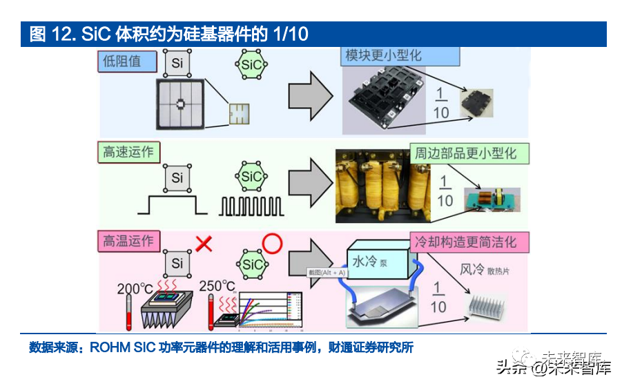 2)器件得以小型化:SiC 禁帶寬度決定了它能夠以更高的摻雜濃度、更薄的膜厚漂移層制作出 600V 以上的高壓功率器件(對于相同耐壓的產品、同樣的導通電阻,芯片尺寸更小);SiC 飽和電子漂移速率高,所以 SiC 器件能實現更高的工作頻率和更高的功率 密度,因頻率的提升減少了電感、變壓器等外圍組件體積,從而降低了組成系統 后的體積及其他組件成本。SiC 帶隙寬并且導熱率顯著,不僅在高溫條件下也能穩定工作,器件散熱更容易, 因此對散熱系統要求更低。