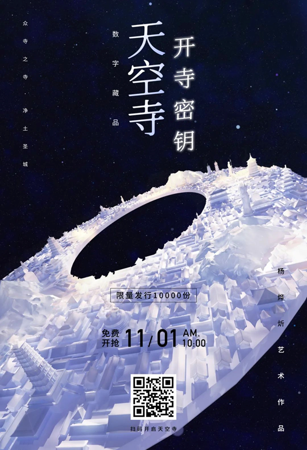 當然,這不止是一段單純的天空寺預告視頻。11月1日,這段視頻以數字藏品的形式正式發售,持有該數字藏品,就相當于持有了前往天空寺的未來之鑰,待2023年天空寺正式開放時即可作為開啟天空寺元宇宙世界之門的鑰匙使用。
