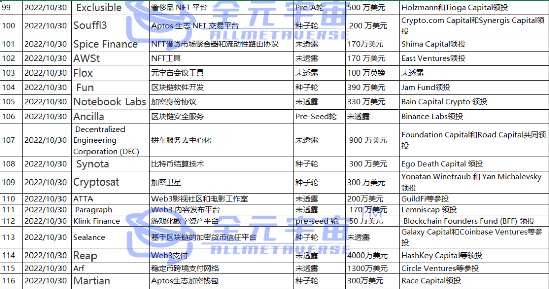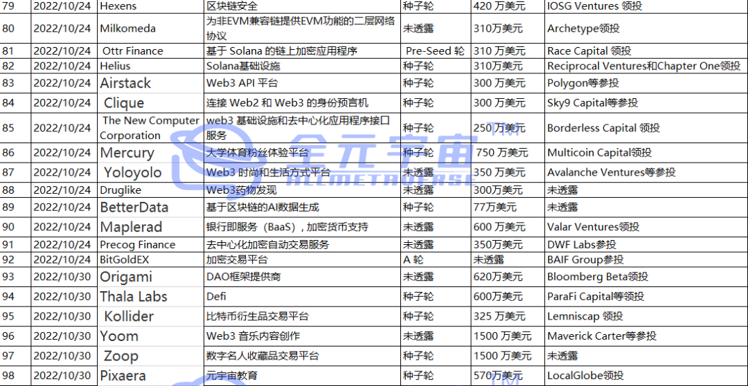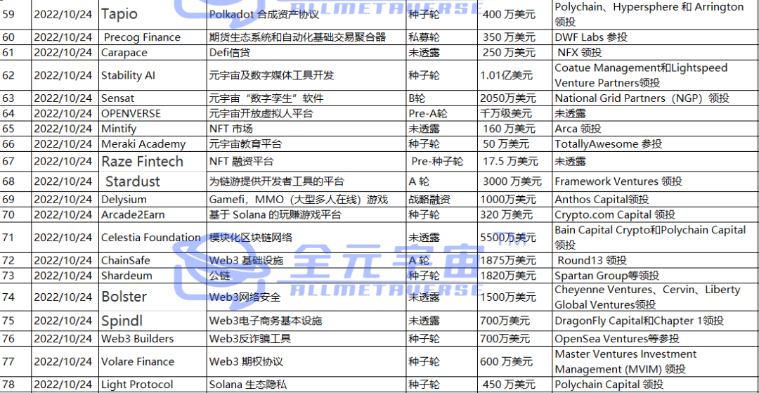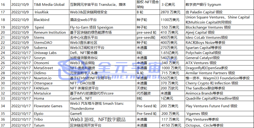1、融資時間以媒體披露時間計算,本次統計時間為2022年9月;2、數據來源互聯網,全元宇宙Allmetavese整理制圖,圖片及數據引用需寫明來源。