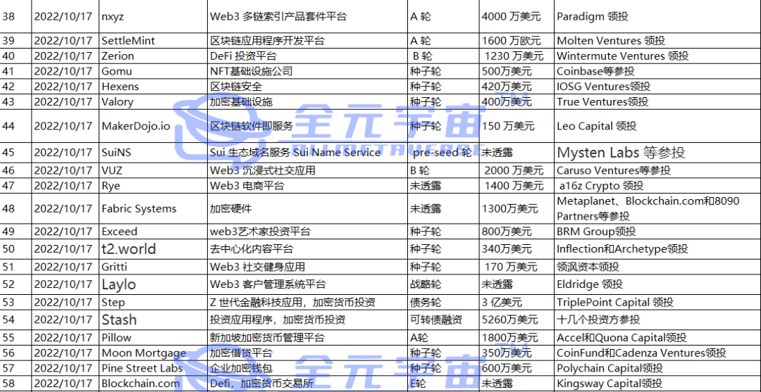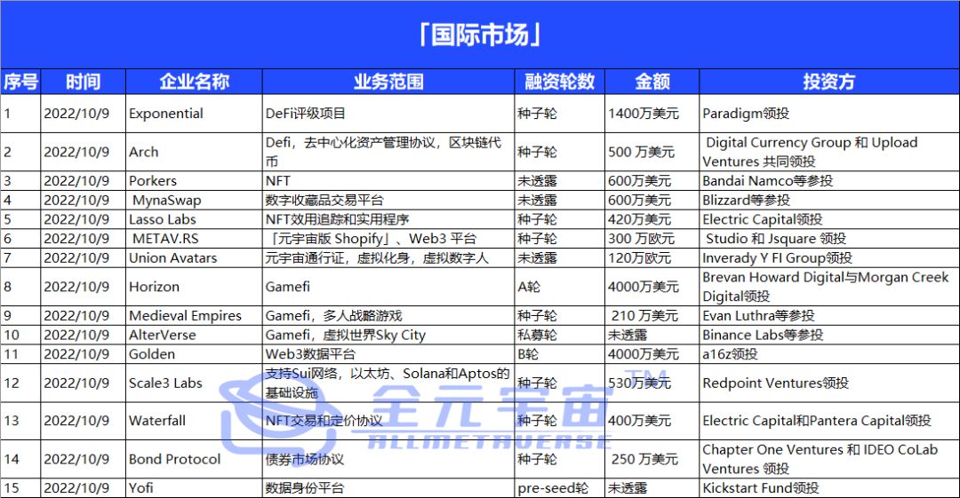 以下是國內市場與國際市場2022年10月元宇宙融資事件統計表: