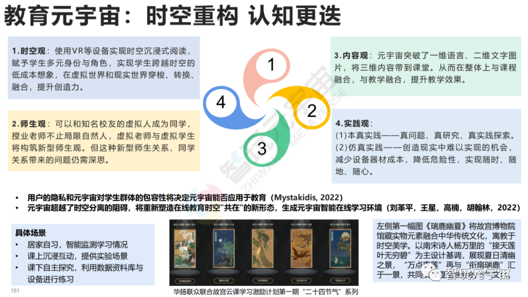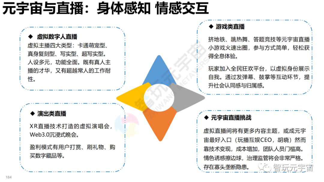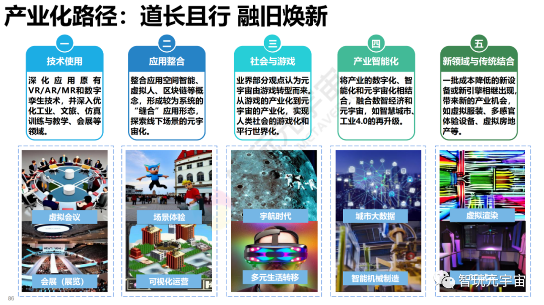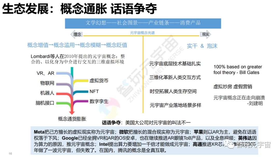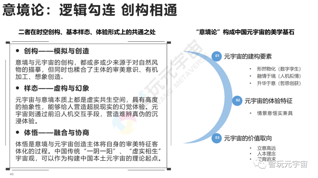 ü 第三部分從軟硬件及平臺發展分析元宇宙發展現狀,提出“人-貨-場-器-境-藝”概念,比較中西元宇宙企業差異,總結行業發展動態,并進行分析預測。以元宇宙理論去指導元宇宙實踐發展,虛實共生,數實融合,促進未來產業良性發展。