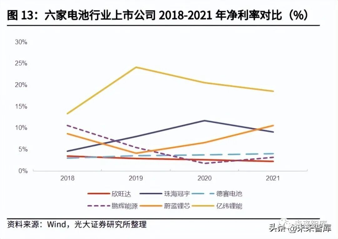 由于產品類型、應用領域、客戶群體等方面的區分,六家電池行業典型企業的 毛利率與凈利率水平存在一定差異。毛利率方面,德賽電池主營鋰離子電池 Pack 與電源管理系統業務,欣旺達由 Pack 向消費電芯延伸,而電池模組 Pack 的技術壁壘較低,因此兩家企業毛利率相對處于較低水平。鵬輝能源的輕 型動力與儲能業務占比提升,一定程度上拉低總體毛利率。蔚藍鋰芯營收結構 不斷向盈利能力較強的鋰離子電池業務傾斜,近三年毛利率持續提升。億緯鋰 能、珠海冠宇毛利率相對較高,近三年均位于 20%之上。凈利潤方面,億緯鋰 能凈利率較高主要系持股思摩爾國際帶來的投資收益影響,其余五家企業凈利 率較為接近。2021 年電解液、正極、負極、集流體等材料價格集體上漲,珠海 冠宇、億緯鋰能的毛利率與凈利率均出現明顯下滑。2022 年,隨鋰電上游產能 逐步釋放、下游價格傳導機制趨于完善,預計電池廠商盈利端壓力將有所緩 解。