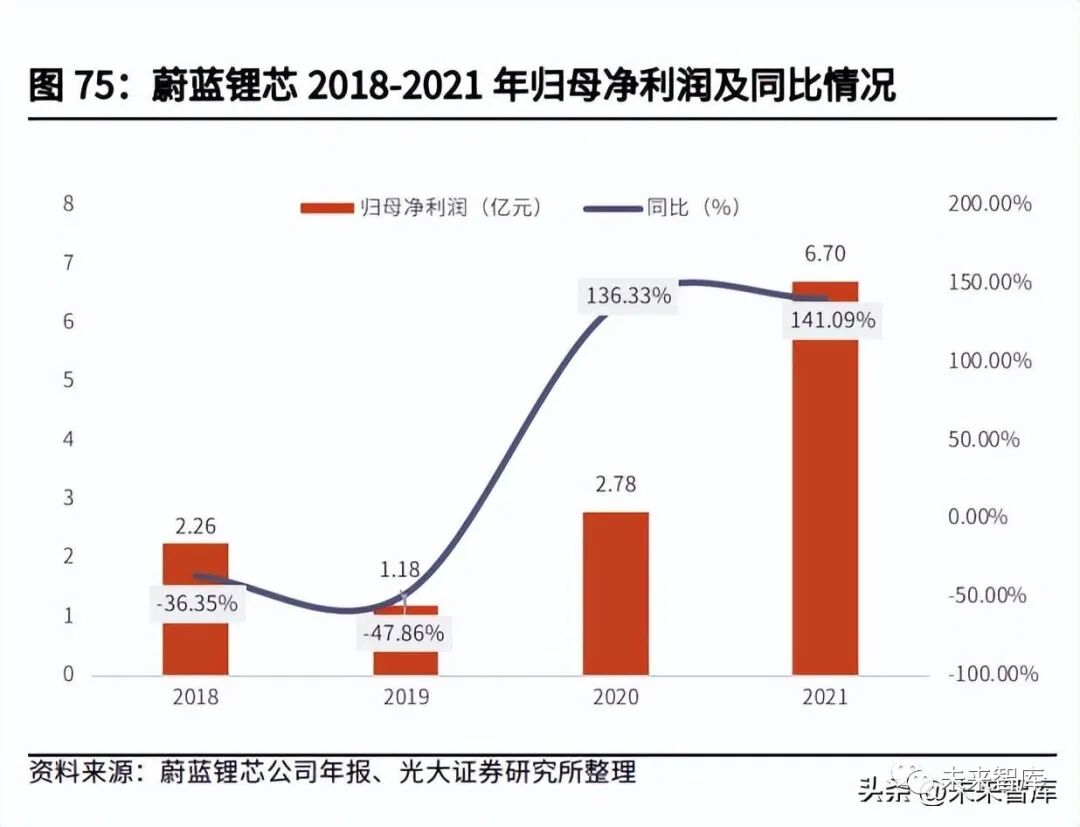 公司概況:蔚藍鋰芯成立于 2002 年,現今擁有近 20 家控股子公司遍布于蘇 州、上海、東莞、淮安、揚州地區。公司主要從事鋰電池、LED 芯片及金屬物 流配送三大業務。全資子公司天鵬電源有限公司深耕鋰電池業務領域,在三元 圓柱動力電池領域具有 10 多年的研發和制造經驗的積累,擁有目前國內外頂 尖水平圓柱型鋰電池自動化產線,具有大規模的圓柱型動力鋰離子電池生產能 力。目前公司已經與國際一線廠商保持穩定合作,成為國內高端工具類鋰電池 領先供應商。公司 2021 年的營業總收入為 66.80 億元,同比增長 23.29%,歸母凈利潤約為 6.70 億元,同比增長 141.09%,扣非歸母凈利潤約為 5.83 億元,同比增長 215.11%,毛利率為 20.42%,凈利率為 10.62%。公司 2022 年上半年的營業 總收入為 38.02 億元,同比增長 25.72%,歸母凈利潤約為 3.51 億元,同比增 長 3.49%,扣非歸母凈利潤約為 2.90 億元,同比下降 3.75%,毛利率為 16.78%,凈利率為 10.23%。公司 2021 年金屬物流業務在總收入中占比約 40.63%,鋰電池業務在總收入中 占比約 40.02%,LED 業務在總收入中占比約 19.20%,其他主營業務在總收入 中占比約 0.15%。