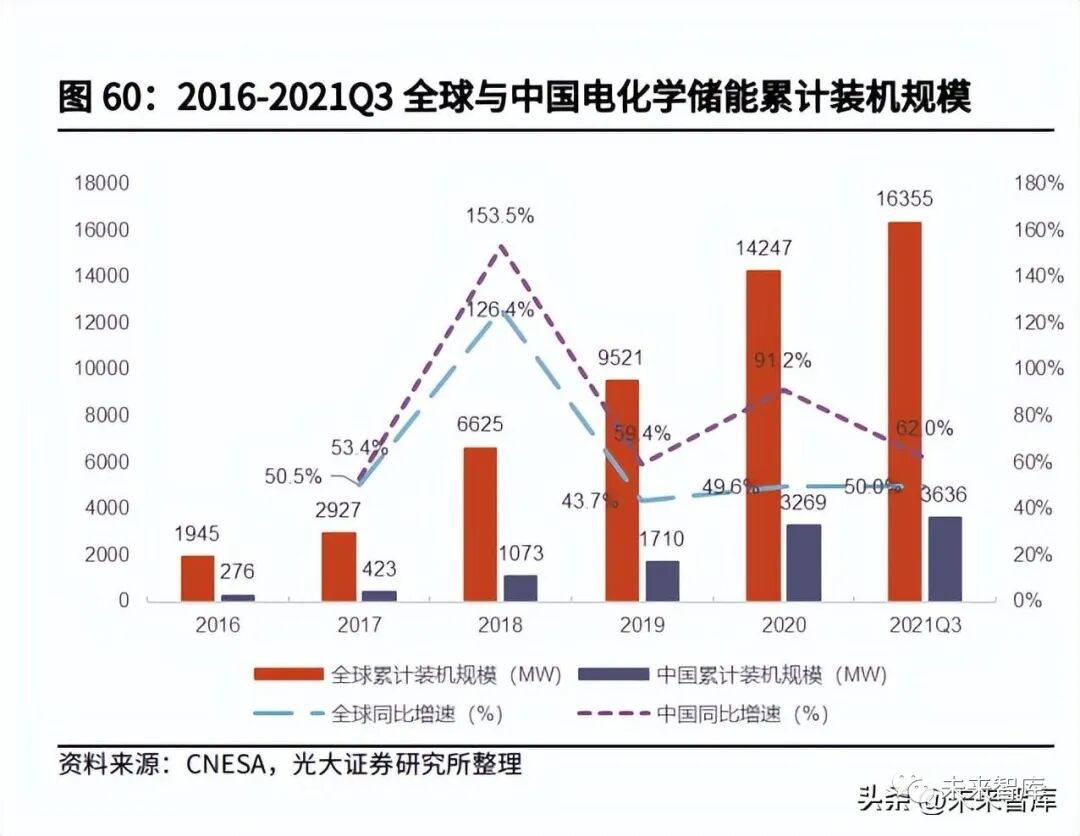 電化學儲能具備高環境適應性、高響應速度、高功率和高能量密度等優勢,有 望成為未來儲能的主流路線。現有儲能技術主要分為抽水蓄能、電化學儲能、 熔融鹽儲熱、壓縮空氣儲能和飛輪儲能裝機等,其中抽水蓄能的累計裝機規模 占據絕對優勢,截至 2021 年 9 月底占全球市場比重達到 89.3%,但受選址限 制增速較緩,所占比重持續下降。電化學儲能占全球市場比重為 8.5%,僅次于 抽水蓄能,近年來步入規模化發展階段,貢獻儲能市場主要增量。截至 2021 年 9 月底,電化學儲能全球累計裝機規模達到 16.4GW,同比增長 50%;國內 累計裝機規模達到 3.6GW,同比增長 62%。電化學儲能方式中,鋰離子電池占 據主流,2021 年 9 月底全球累計裝機規模達 15.13GW,占電化學儲能總裝機 規模的 92.8%。